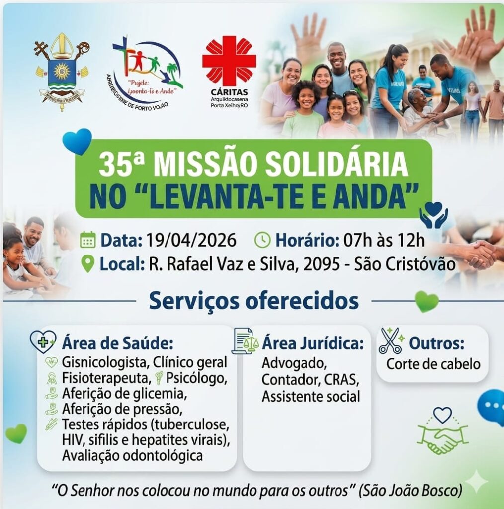 A Arquidiocese de Porto Velho realiza no próximo dia 19 de abril de 2026 a 35ª edição da Missão Solidária “Levanta-te e Anda”, uma iniciativa que expressa o compromisso cristão com a dignidade humana e o cuidado com os mais necessitados.