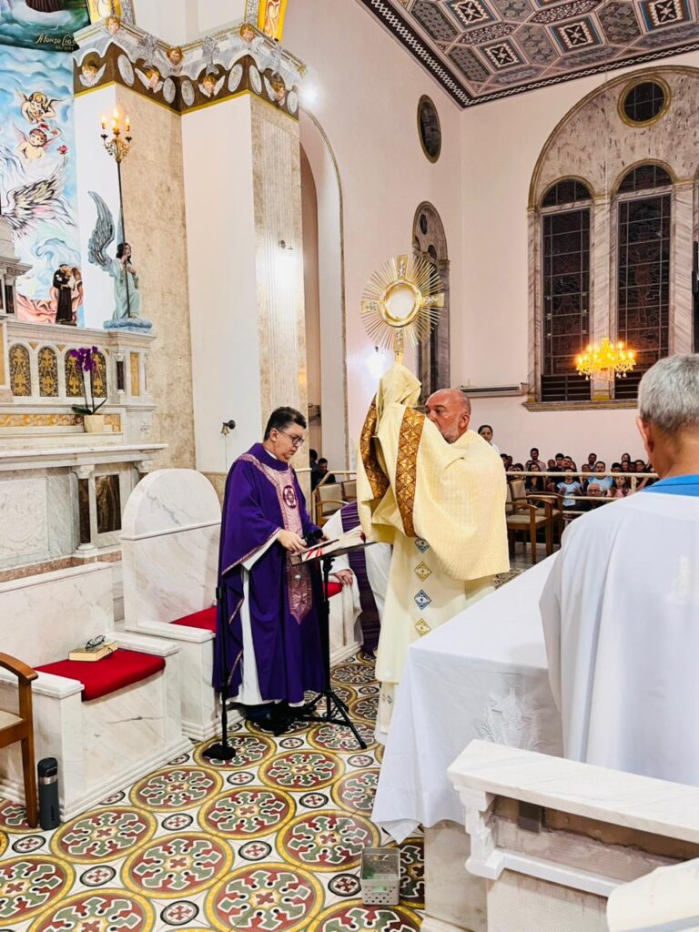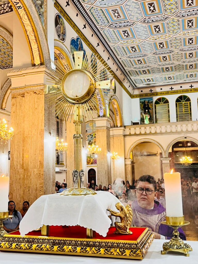 Antes da celebração eucarística, foi realizada a exposição do Santíssimo Sacramento, seguida de um momento de oração e consagração das famílias. Durante esse tempo de adoração, os participantes apresentaram suas intenções e confiaram a Deus suas realidades familiares.