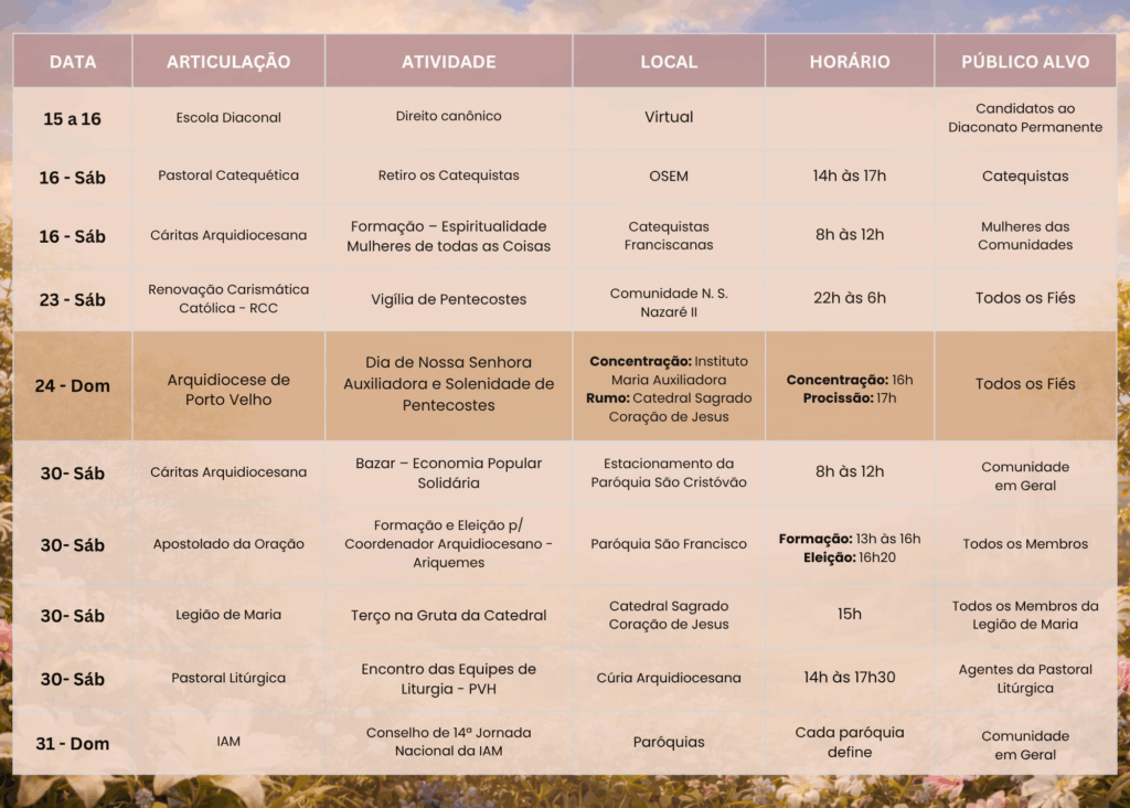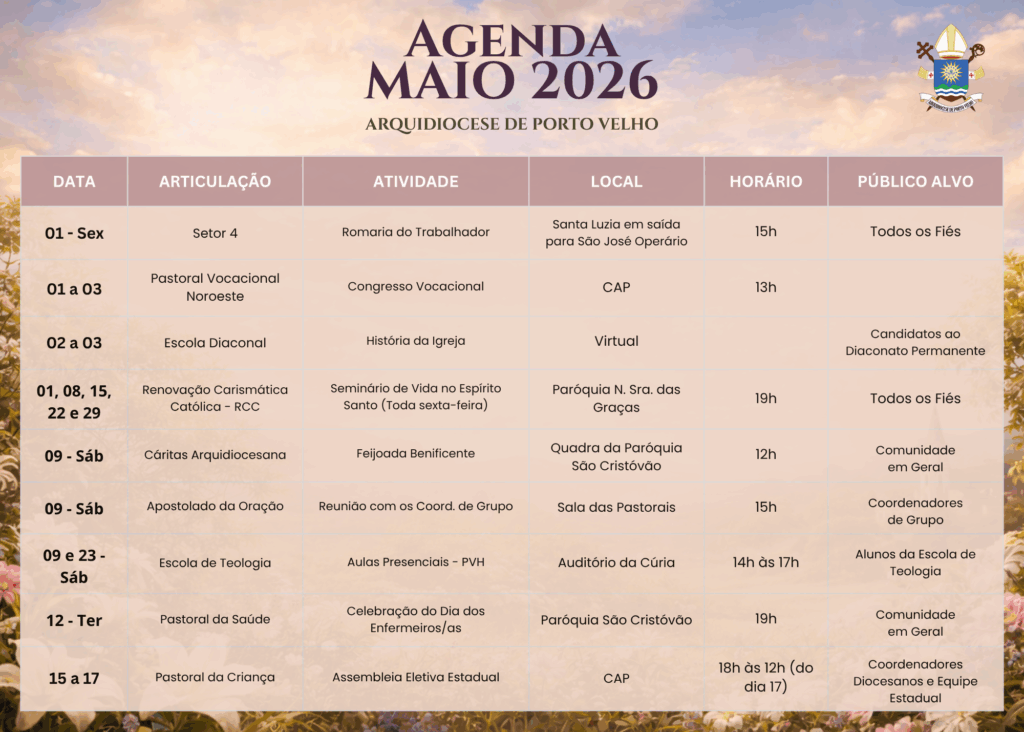 A Agenda Pastoral de Maio de 2026 se insere neste espírito de esperança e comunhão, reunindo celebrações, encontros formativos, ações solidárias e momentos de espiritualidade que fortalecem a caminhada da Igreja Arquidiocesana. O mês será marcado pela Solenidade de Pentecostes e pela Festa de Nossa Senhora Auxiliadora, padroeira da Arquidiocese de Porto Velho.